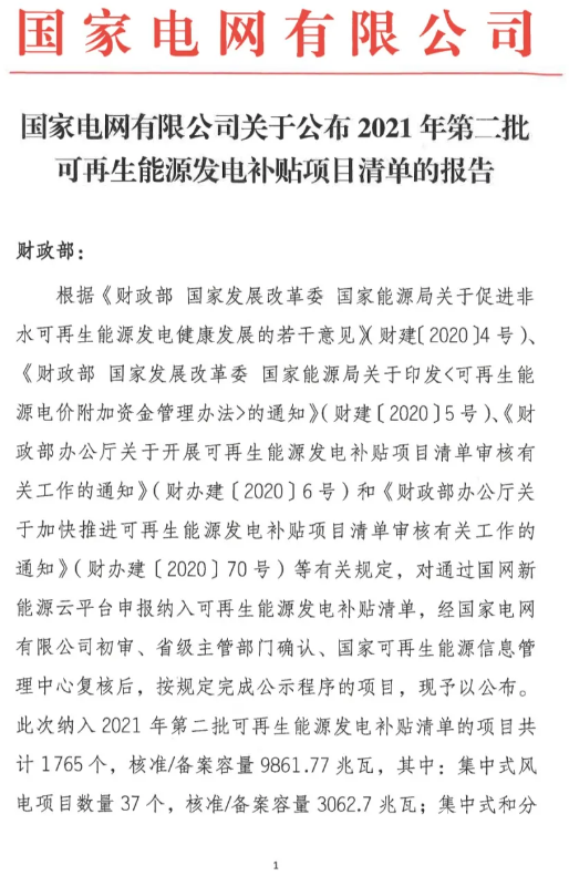 關(guān)于公布2021年第二批可再生能源發(fā)電補(bǔ)貼項(xiàng)目清單的公告